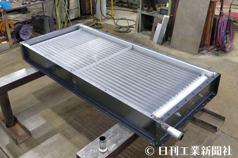 フィンチューブ式熱交換器は、複数のフィン(放熱板)にチューブを貫通させた構造の「プレートフィン」がコアとなる。チューブ内に液媒体を流すことで、ガス体を熱交換する仕組み。シェル&チューブ式と比べ、高い性能を維持したまま小型化できるのがメリットだ。井上裕邦営業部次長は「コンパクト化できるかどうかで、提案に差が出る」と自社の強みを分析する。