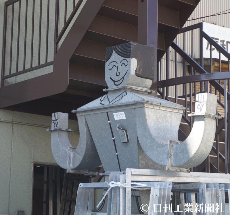 工場ではダクト部品を組み合わせた人形が技術をアピールする