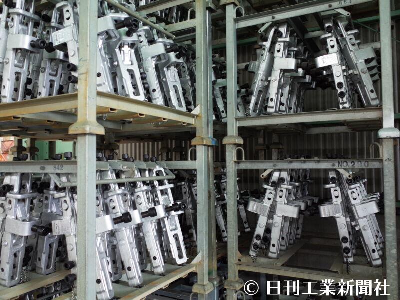 港製器工業(大阪府高槻市、岡室昇志社長)が手がけるのは、コンテナを船にワイヤなどで固定するラッシング資材。「世界に残るのは4社。海外3社と競合できるのは当社だけ」と岡室社長は話す。金具を固定するロックと、外すアンロックの両方でレバー操作が不要なフルオート型のツイストロック「FA―8」は、100隻以上の船舶で100万個以上の納入実績があるベストセラーだ。
